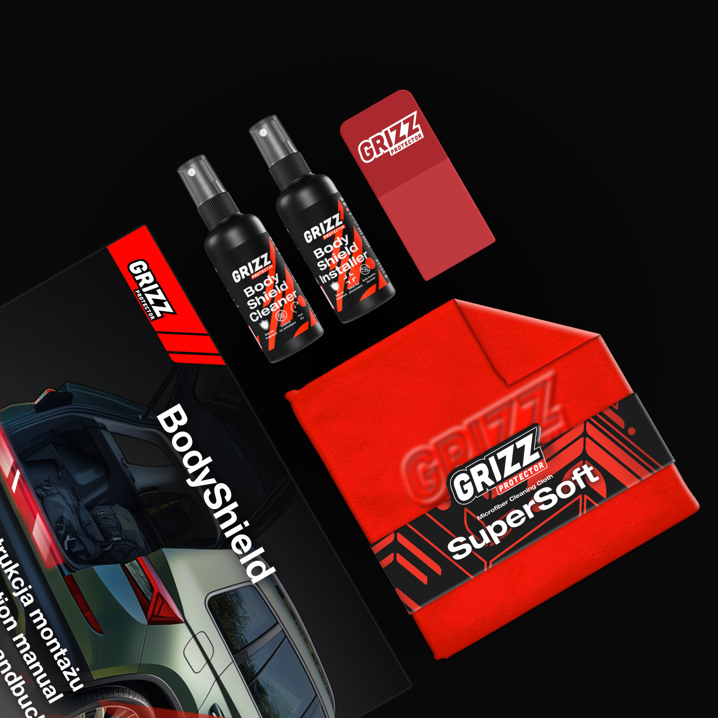 Wyczyść dokładnie wybrany element przy użyciu płynu BodyShield Cleaner oraz ściereczki z mikrofibry, a następnie obficie spryskaj go żelem BodyShield Installer. Zerwij folię z podkładu, spryskaj tylną stronę folii żelem i ułóż ją na mokrej powierzchni. Wyrównaj i ostrożnie wygładź raklą folię od środka na zewnątrz, usuwając żel – bez silnego docisku. Korzystając z ściereczki oraz BodyShield Cleaner ostrożnie wyczyść oklejony element usuwając nadmiar żelu. Po montażu folii nie myj auta przez 3 – 4 dni. Na finalny efekt zaczekaj od 48h do 64h.